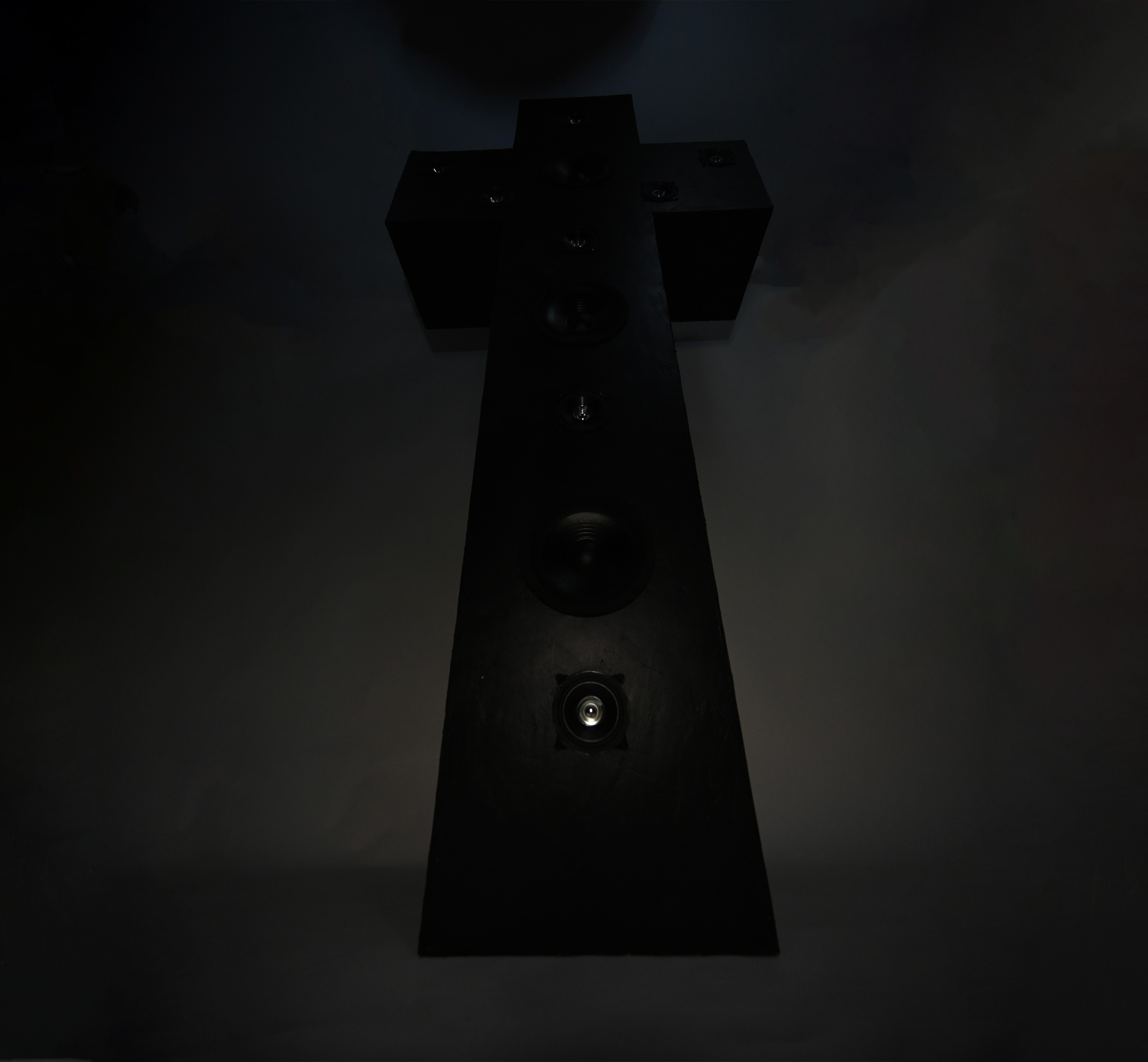The diptych (meant to be presented in the dark) depicts a monolith speaker playing loud music that is slowed 800% and a tall silhouette entity beside it.