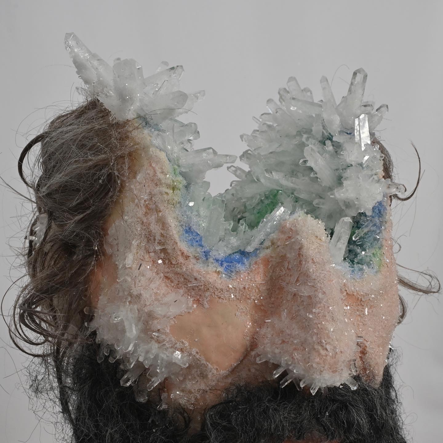 A meditating human with crystals growing out of its head to resemble a sailor that has reached enlightenment but also has been weathered and eroded by the ocean.